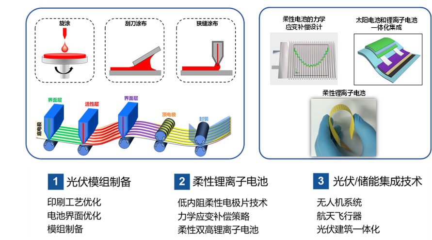 研究1:光伏技术,由孙艳明教授负责,研究方向包括有机半导体材料、钙钛矿材料和无机半导体材料等在光伏器件中的应用。聚焦叠层器件和太阳能电池模组性能优化以及与锂电池集成工艺和电压管理系统的开发利用等。平台拥有全流程的光伏器件制备、封装、集成、测试、表征和基础物理研究的设备,如惰性气体手套箱、太阳光模拟器、太阳能电池量子效率测试仪、高真空镀膜机、原位光谱分析仪、动态光谱仪、傅里叶变换光电流光谱仪、狭缝式挤压涂布机、太阳能电池老化测试系统、电致发光量子效率测试仪、室内光模拟器、载流子测试分析系统等。